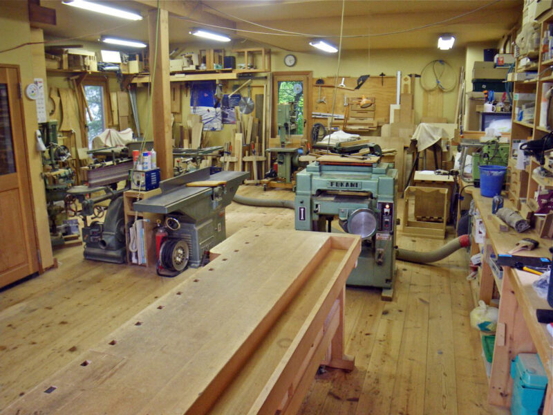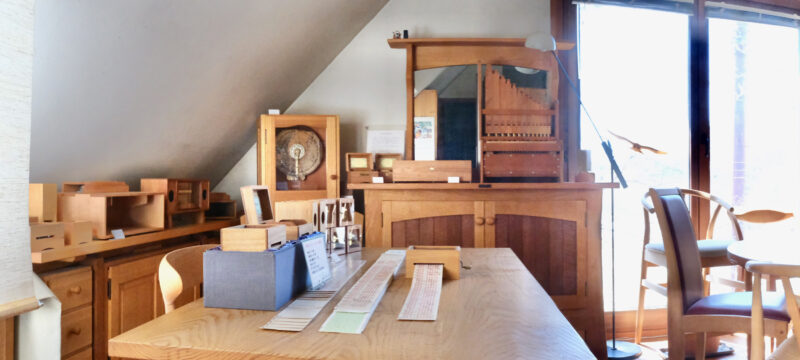 1Fが仕事場で2Fがショールームになります。ショールームには手廻しオルガン、オルゴール、キャビネット、チェスト、棚、テーブル、デンマークのイスなどがあります。